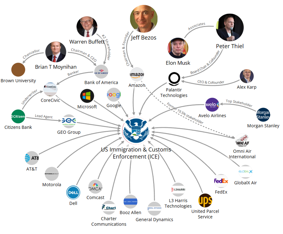 In this piece we name some of these corporate ICE profiteers and deportation barons — from Peter Thiel’s Palantir to Jeff Bezos’s Amazon, from GEO Group to Avelo Airlines, from Bank of America to AT&T — that everyone should know about. We also provide resources and links for further research into other ICE profiteers, including those with a presence in your own locale.